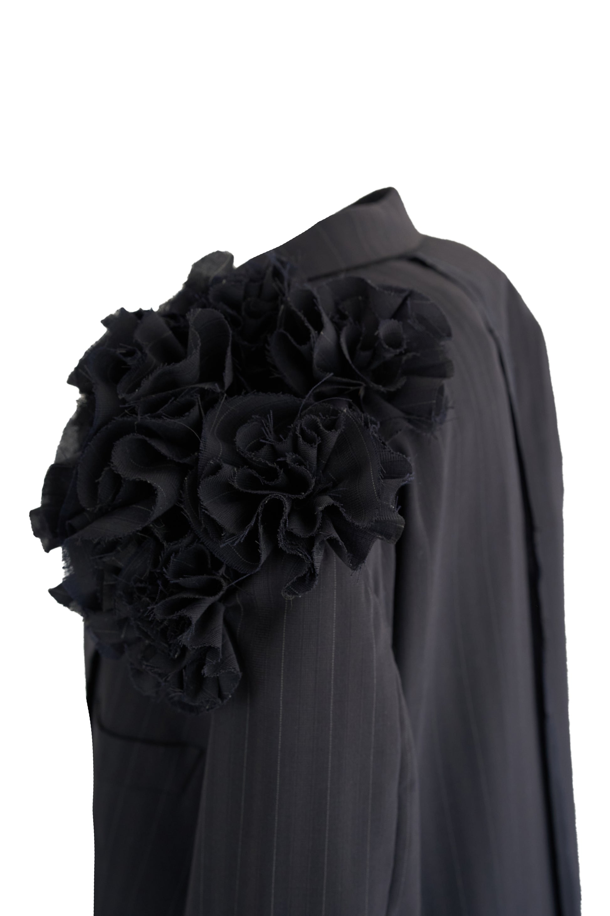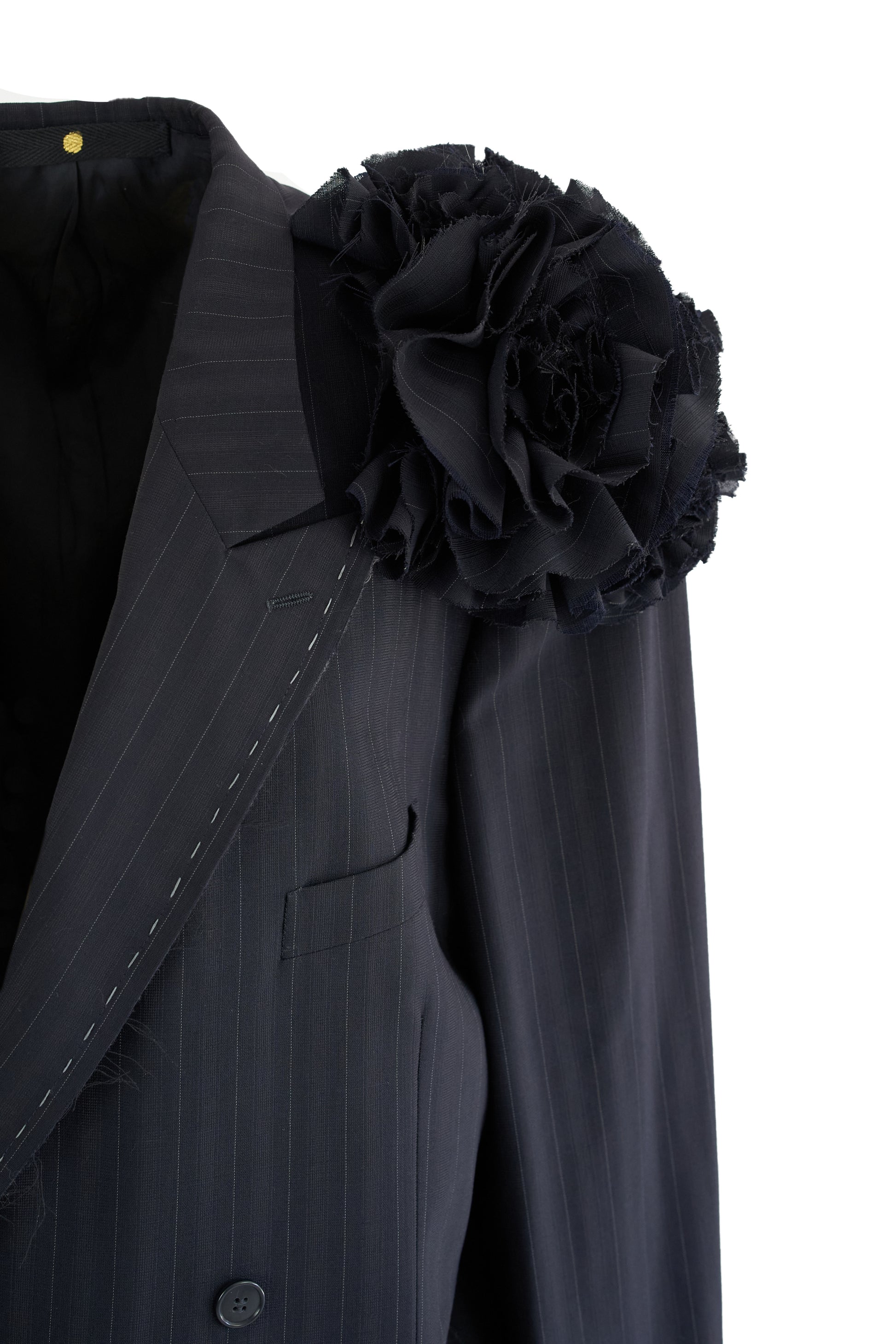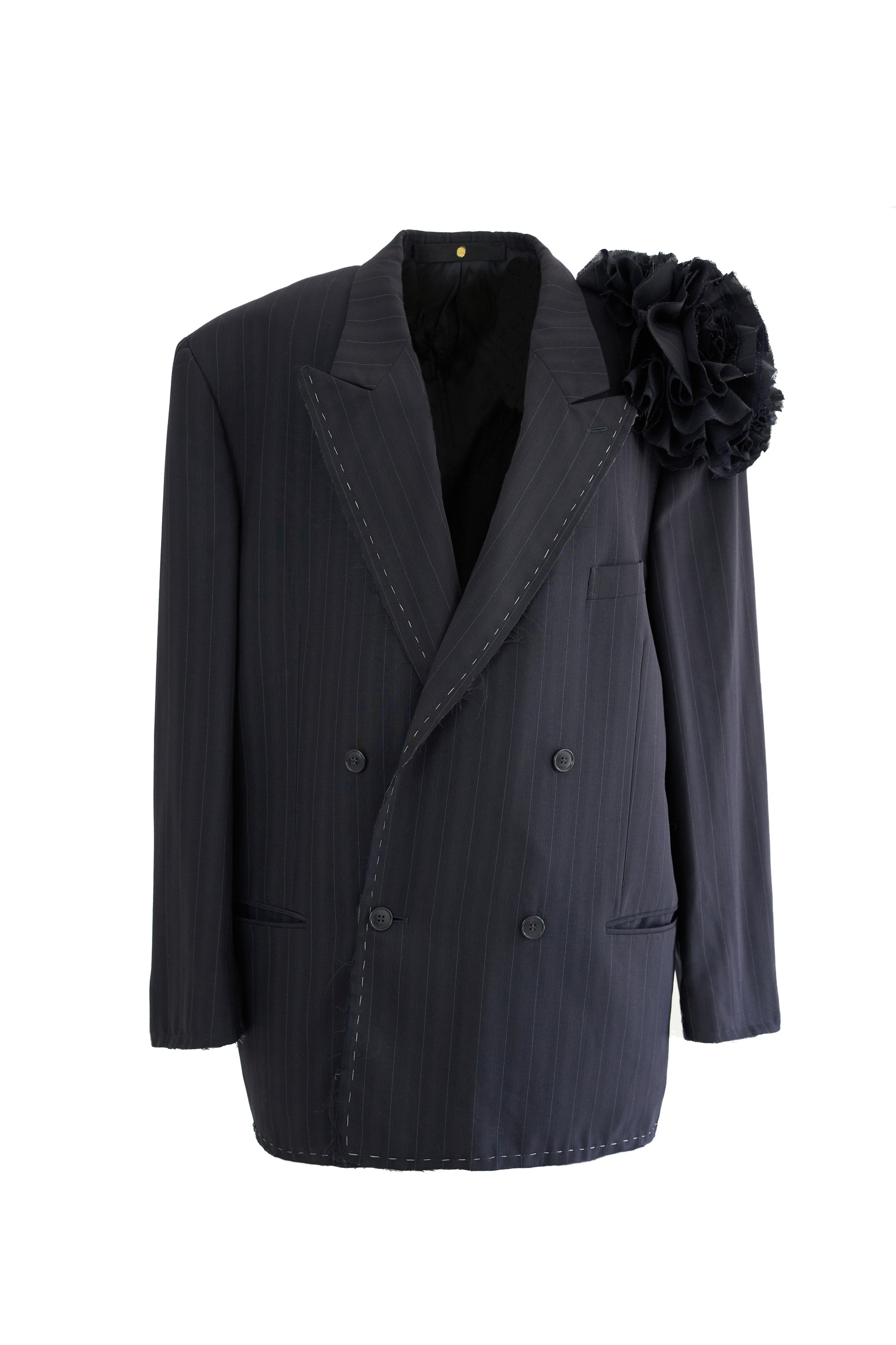 Design Features: The No. 00121 Jacket retains the essence of its original model with thoughtful modifications. The fabric edges are meticulously reprocessed, and the jacket is hand-stitched with gray thread. Unique design elements include visible seam allowances on the front and a voluminous flower crafted from suit trousers, positioned artfully on the shoulder.