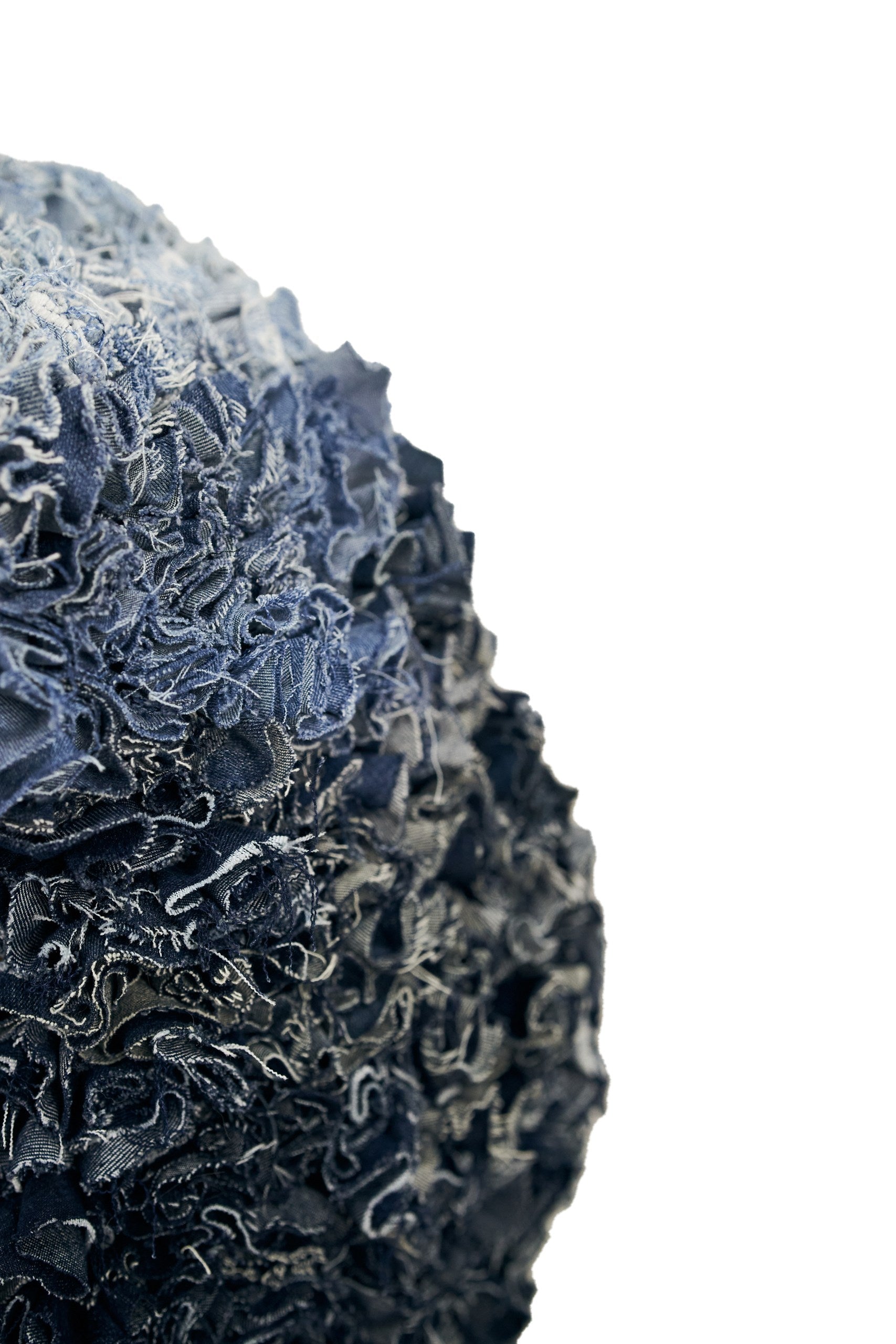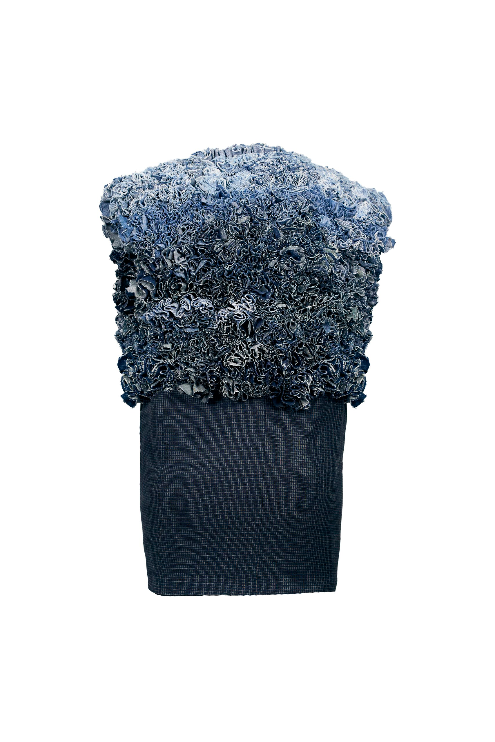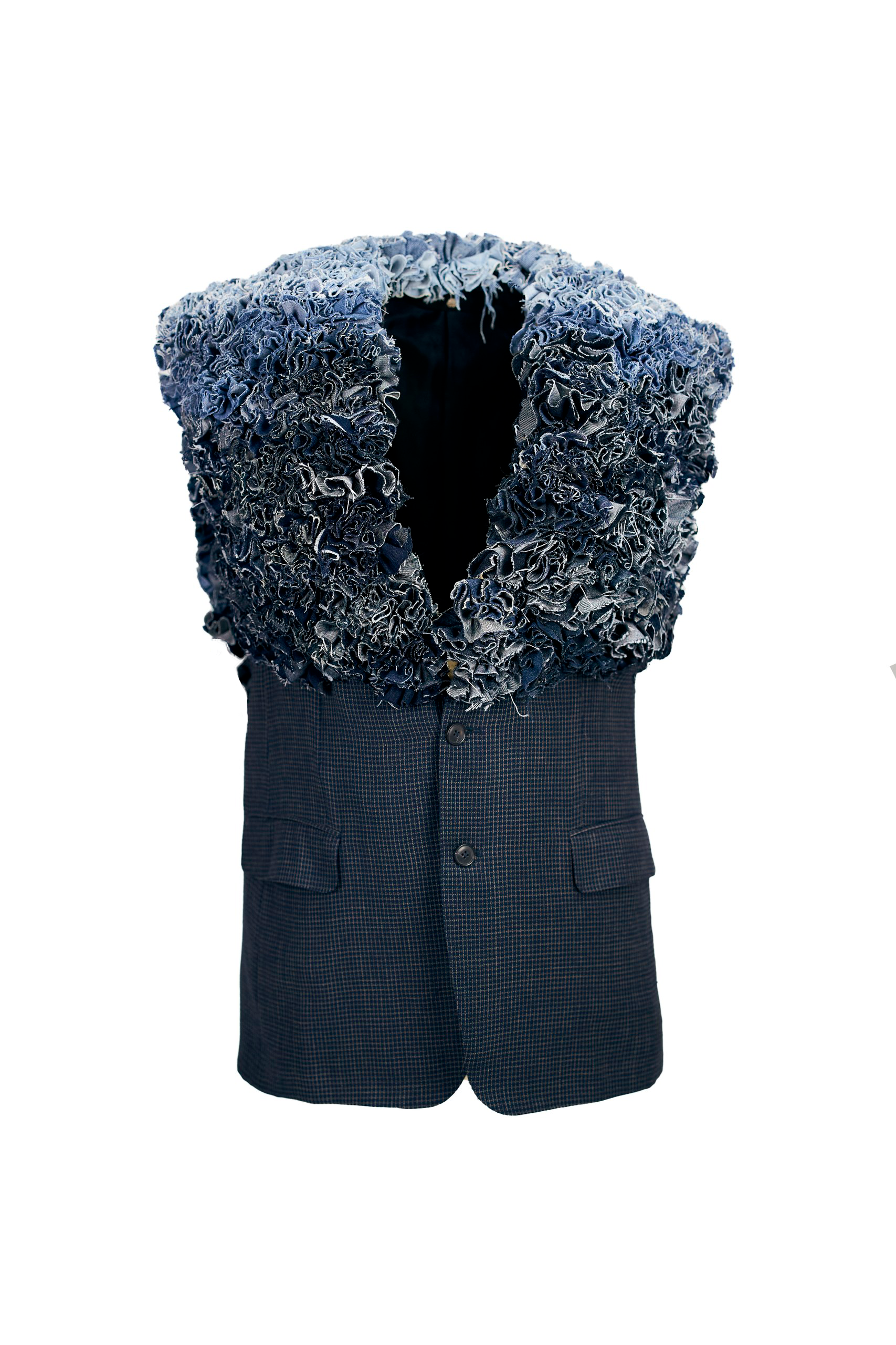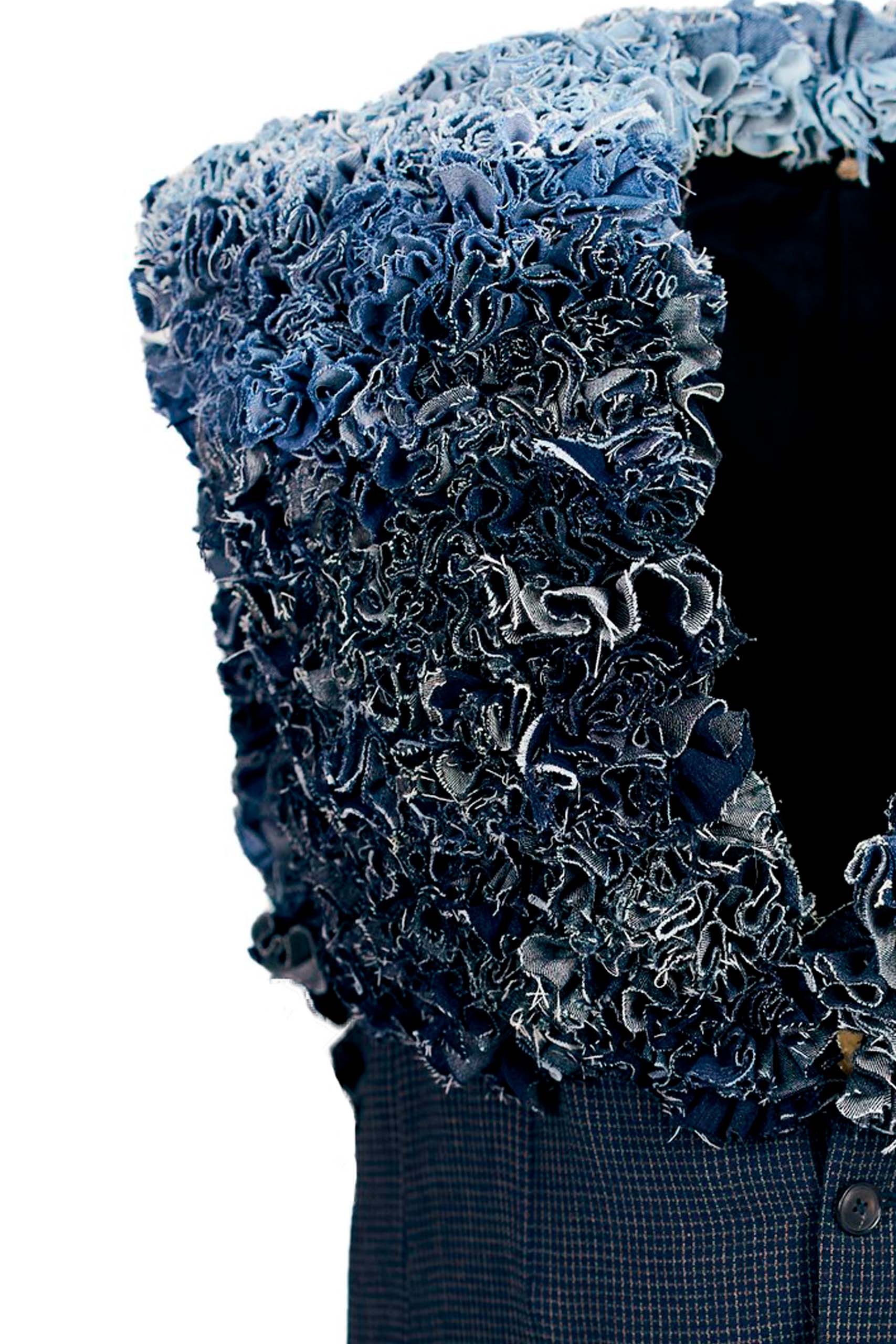 Craftsmanship: This vest is a testament to exceptional craftsmanship. A men's jacket was redesigned with minimal changes, and the sleeves were removed. The texture of the vest is achieved by recycling more than 20 pairs of jeans, showcasing the brand's commitment to sustainability and creativity.