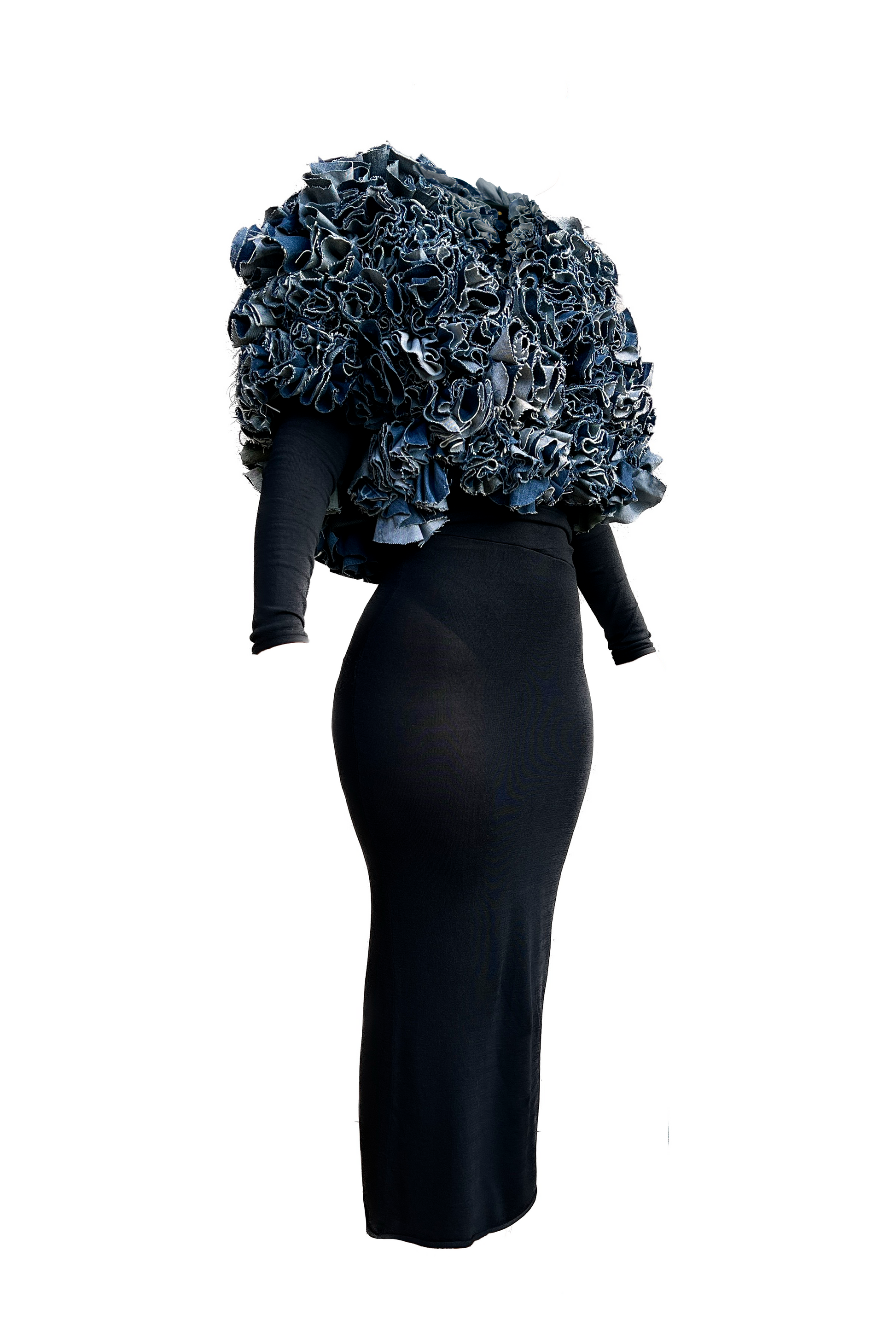 Craftsmanship: This unique vest is crafted from a recycled men's wool jacket. The sleeves and the jacket length have been shortened. Over 10 pairs of jeans were upcycled to create the flounces, showcasing meticulous craftsmanship and a commitment to sustainability.