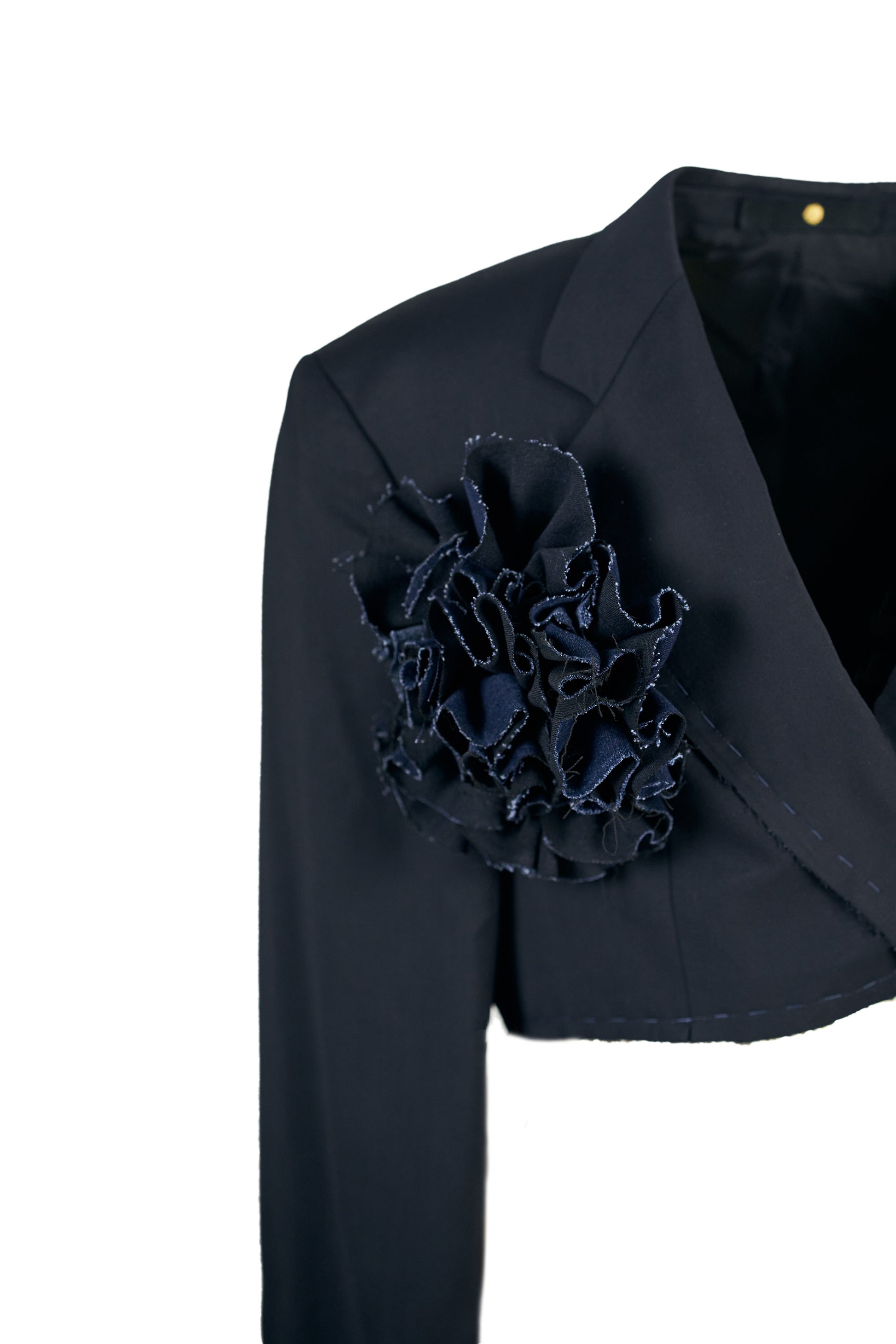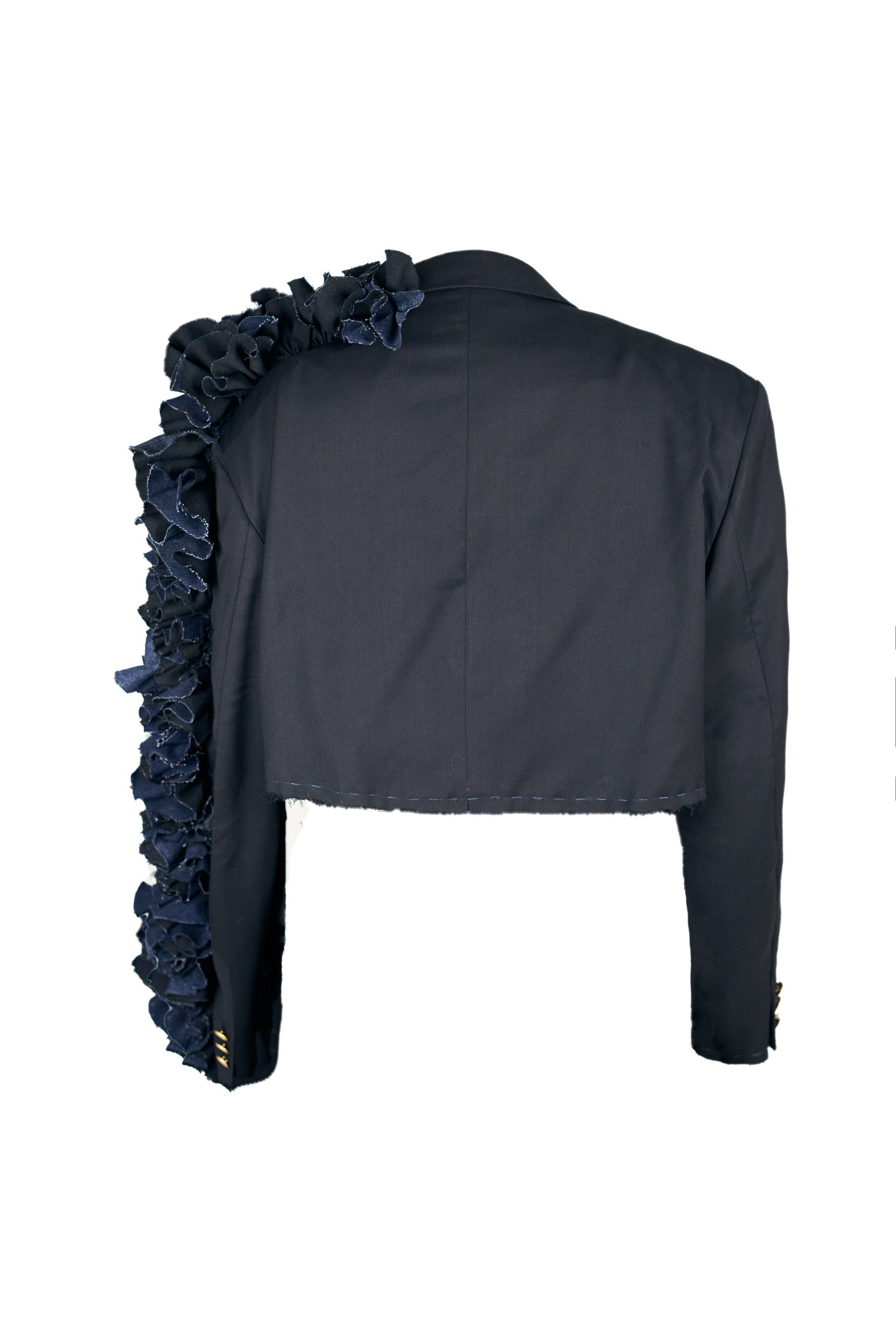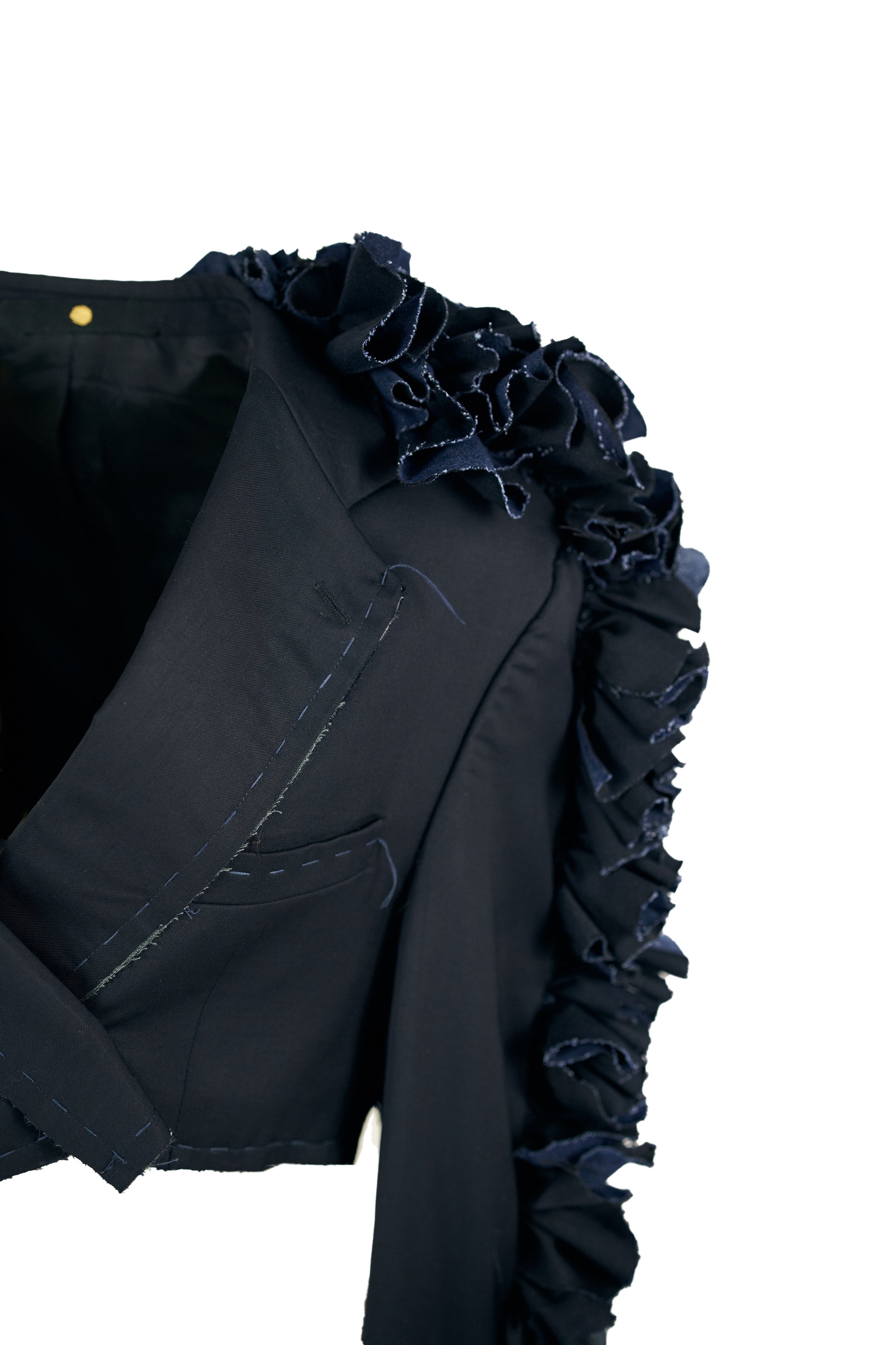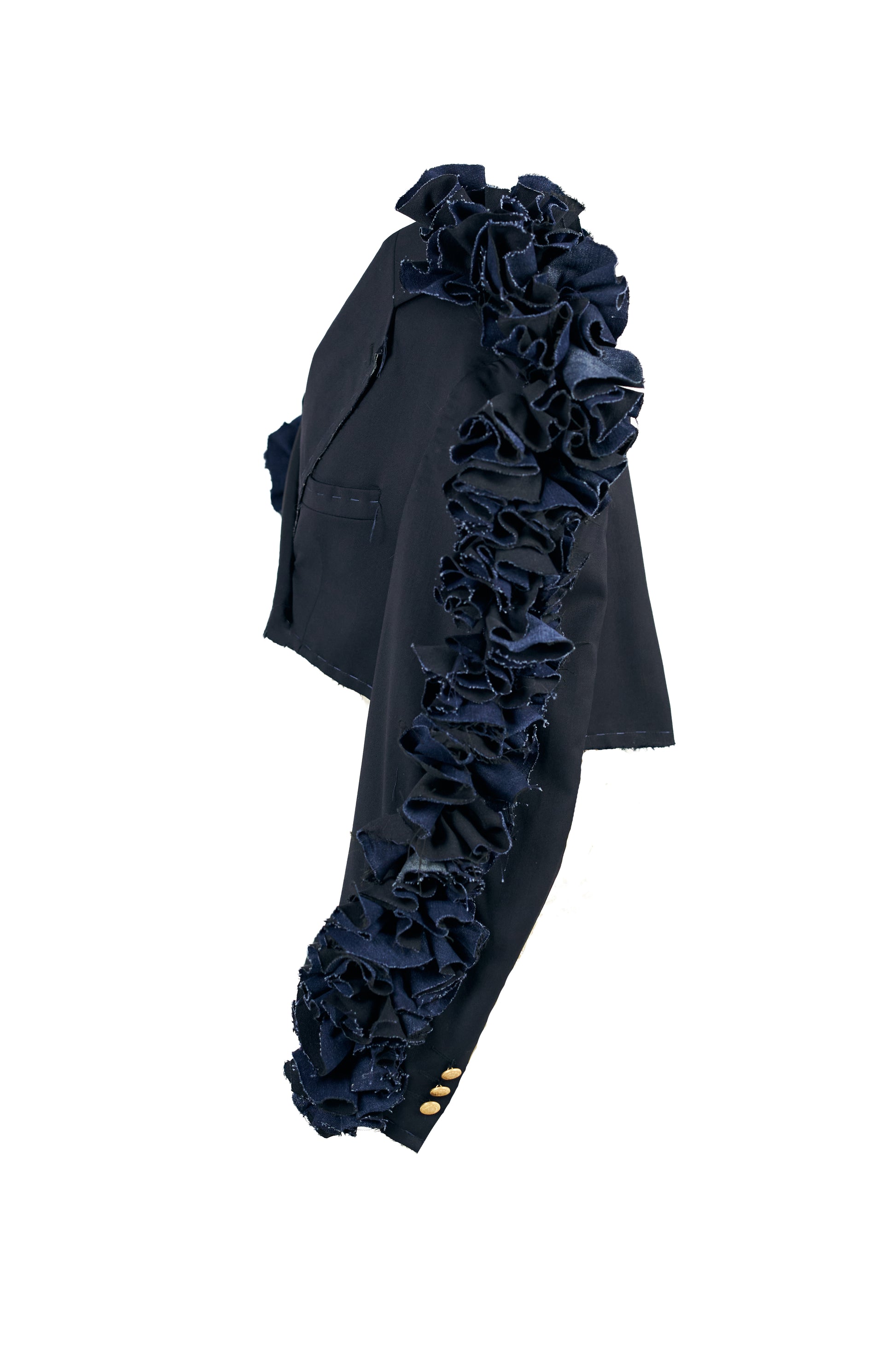 Craftsmanship: This jacket is a created from men's wool jacket, featuring shortened length and unfinished seam allowances for a raw. Hand stitching enhances the edges of the lapels, darts, and hem, showcasing meticulous attention to detail. Two pairs of jeans were recycled to create the intricate ruffles and flower decoration.